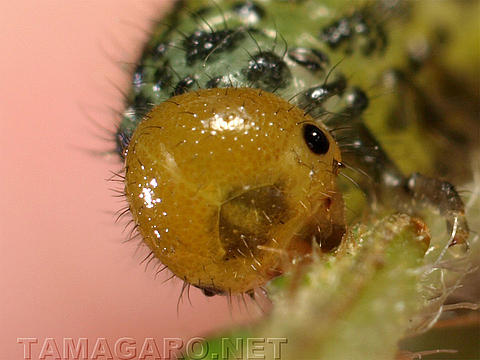 ホストはツツジ。若齢幼虫の頭の色は黒いが、老齢幼虫の頭の色はオレンジ。